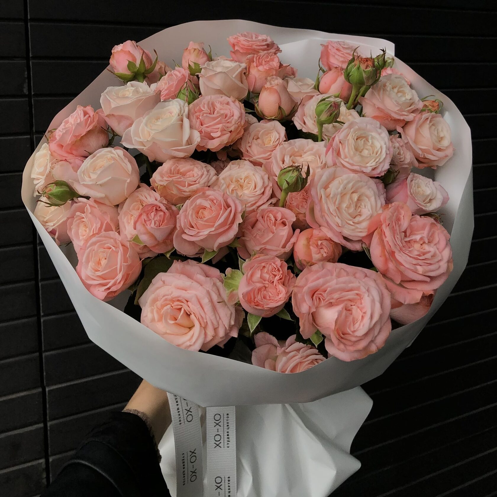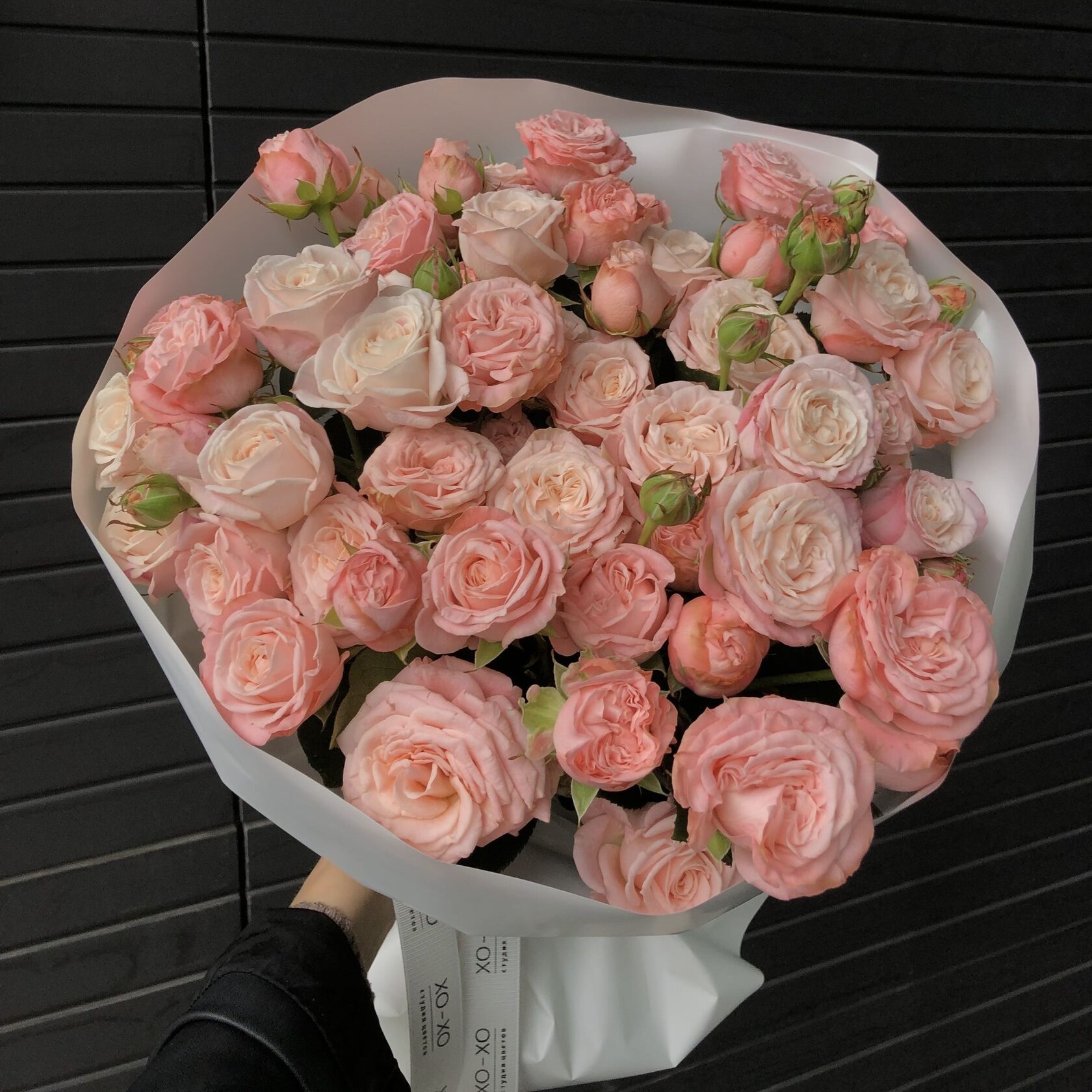 Моно кустовых роз сорта Бомбастик под фирменную ленту без упаковки. В букете на 1ой фотографии 25 шт. Количество веток можно увеличить или уменьшить по согласованию с флористом. На 2ой фотографии варианты оттенком. Наличие уточняйте у флористов.