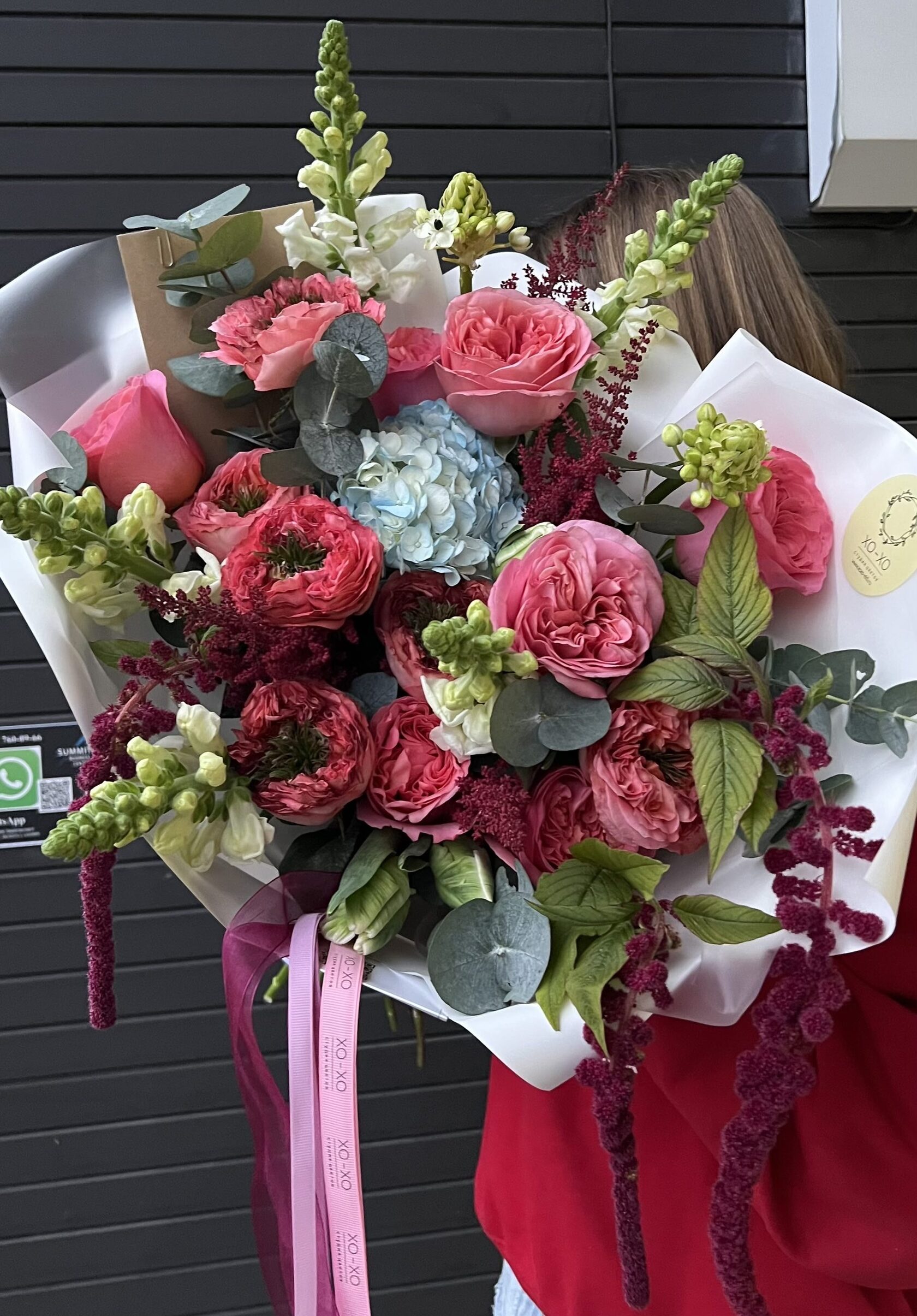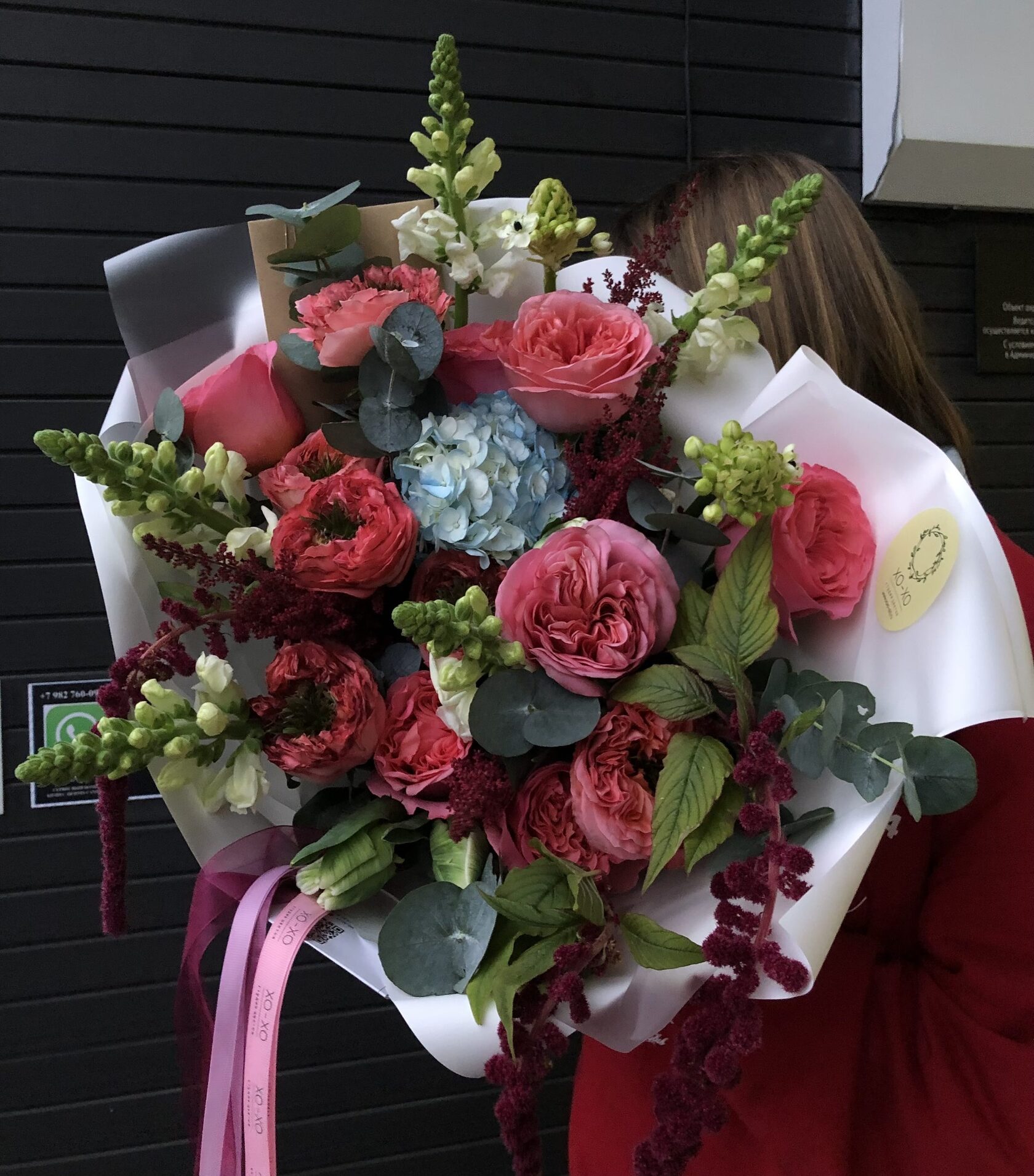 Садовые розы, эустома, эвкалипт, гиперикум, нежная упаковка. Мы не создаём букеты под копирку, мы создаём особенные букеты для индивидуальных людей, учитывая все ваши пожелания. Мы оставляем за собой авторское право определять конечный состав букета, учитывая наличие и сезонность цветов, но гарантируем, что букет сохранит свой стиль, настроение и неповторимость.