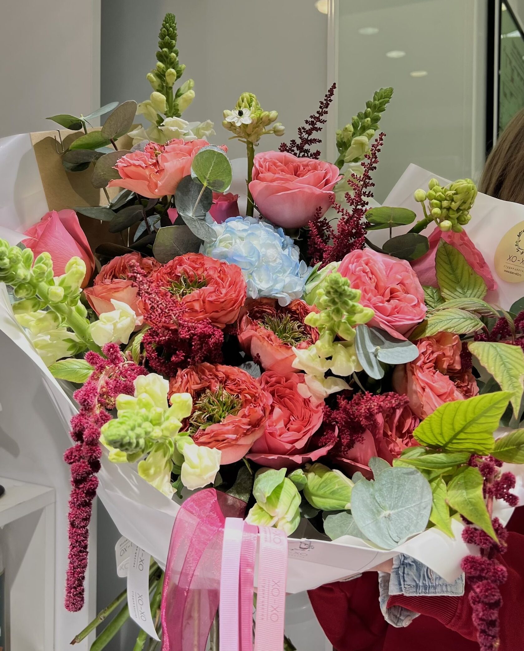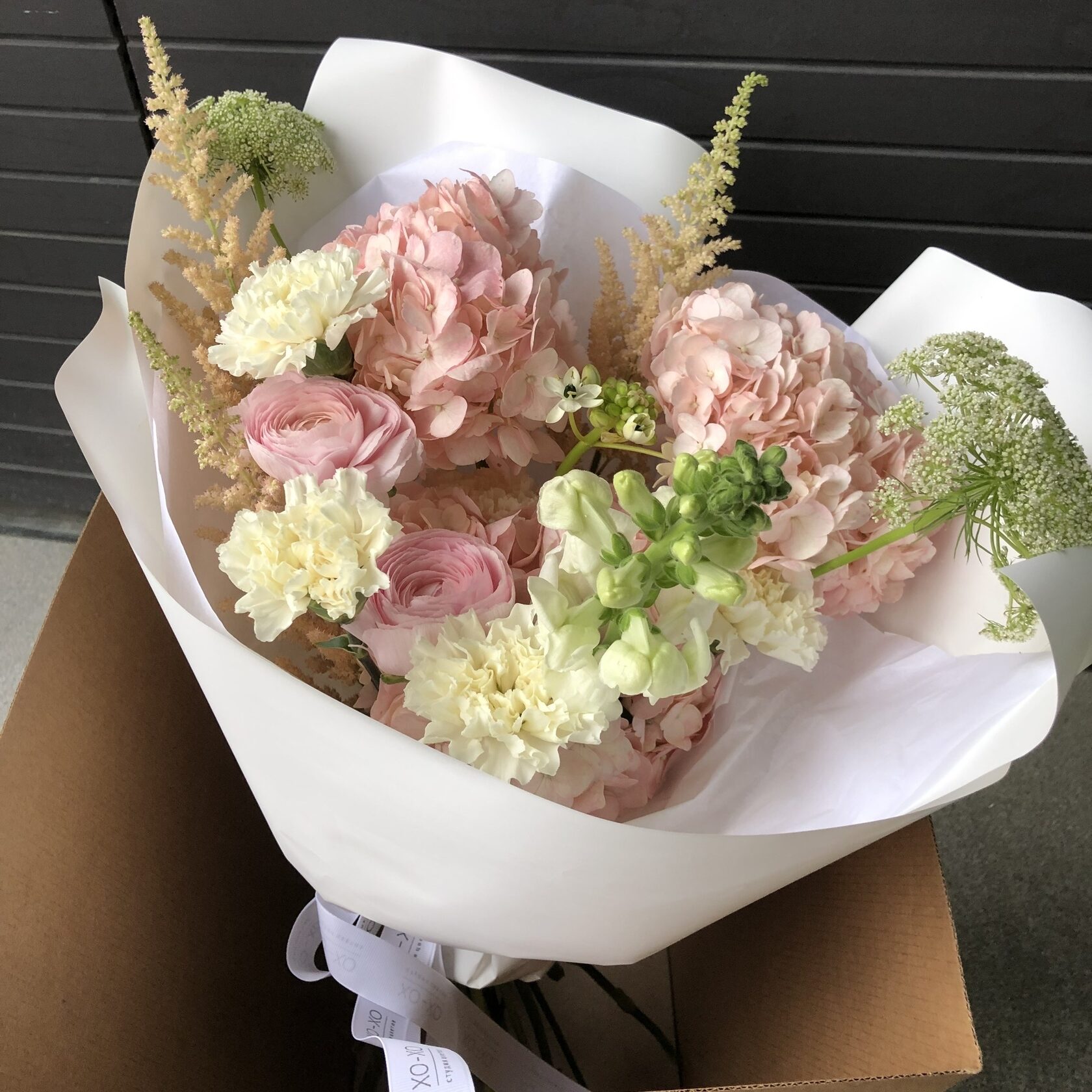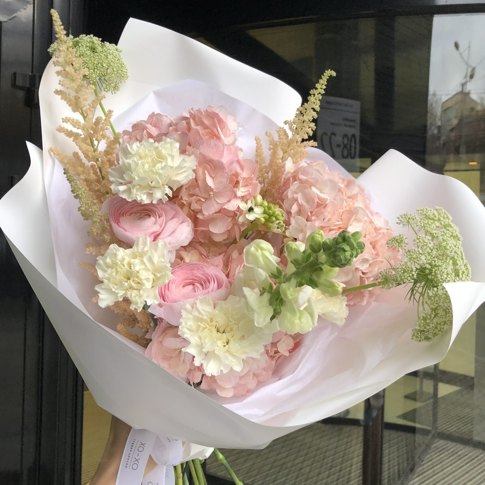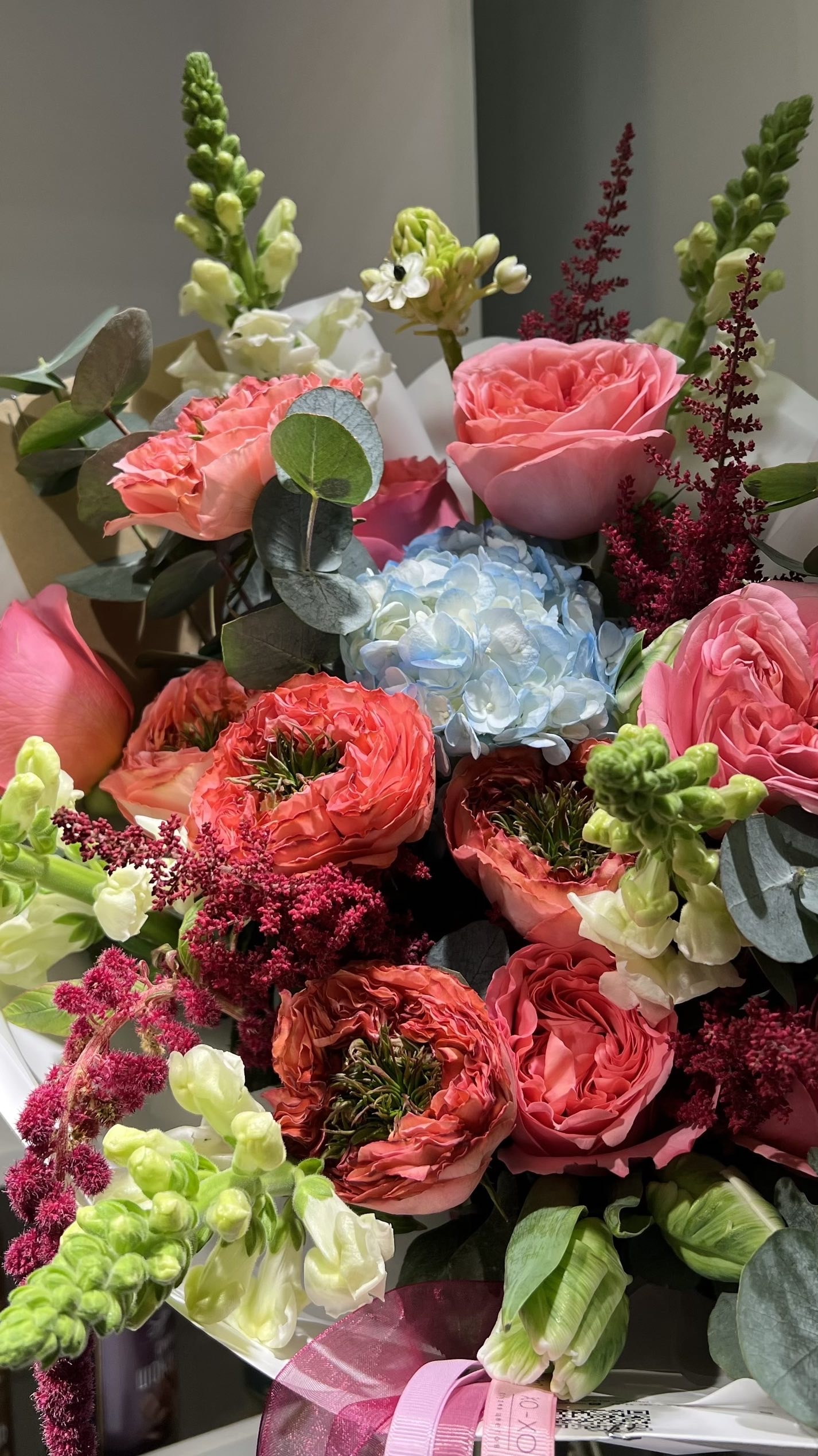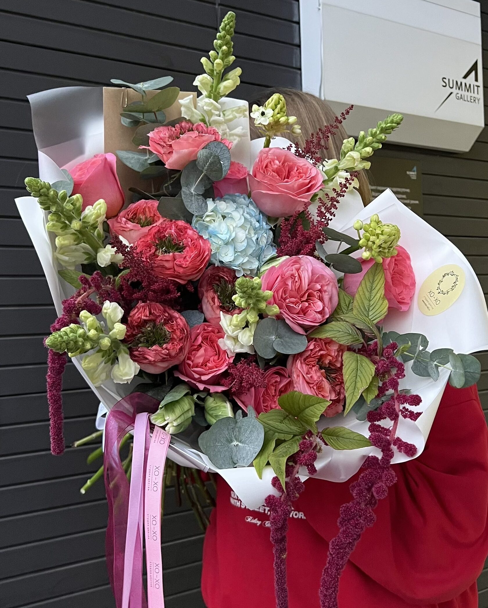 Роскошный состав: ранункулюсы, амми, астильба, гортензия, антиринум и диантусы.