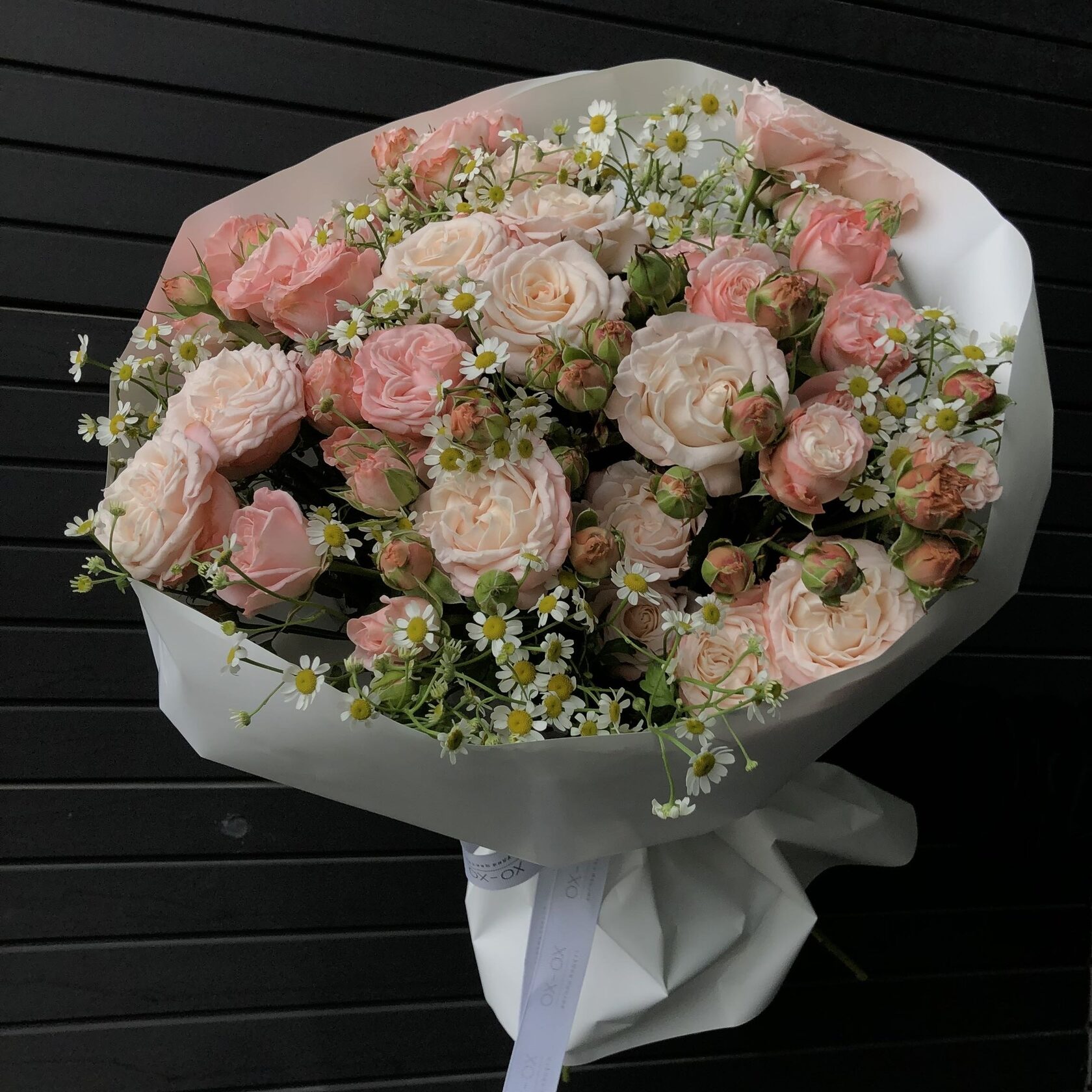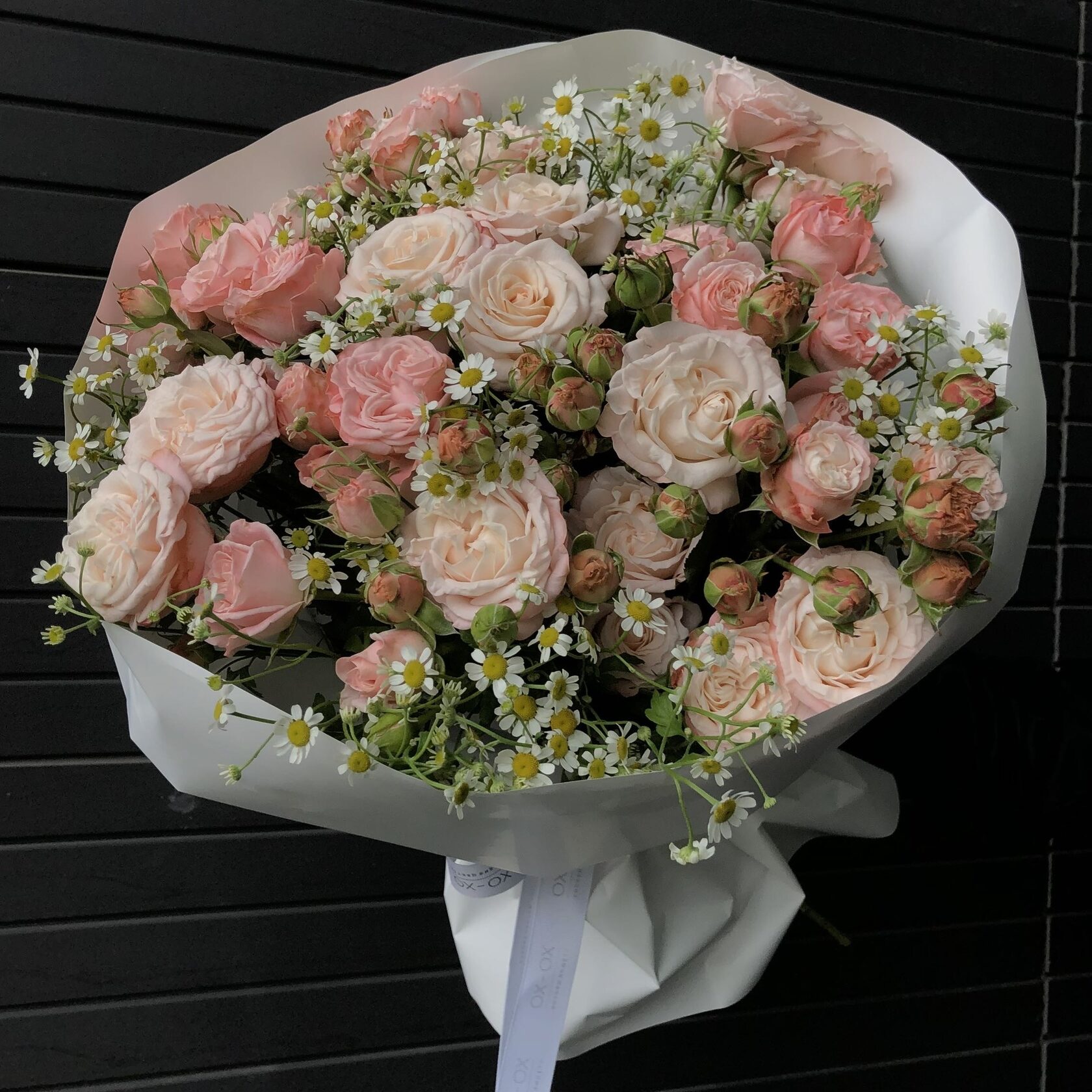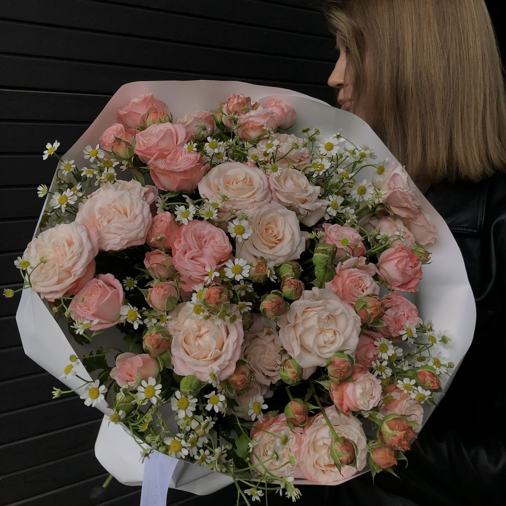 Моно букет из пионовидных кустовых роз сорта бомбасти с ромашками.