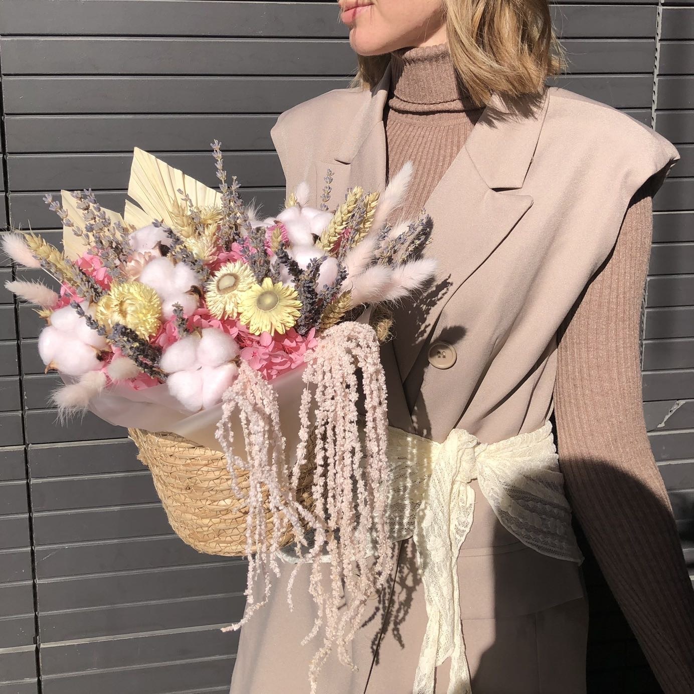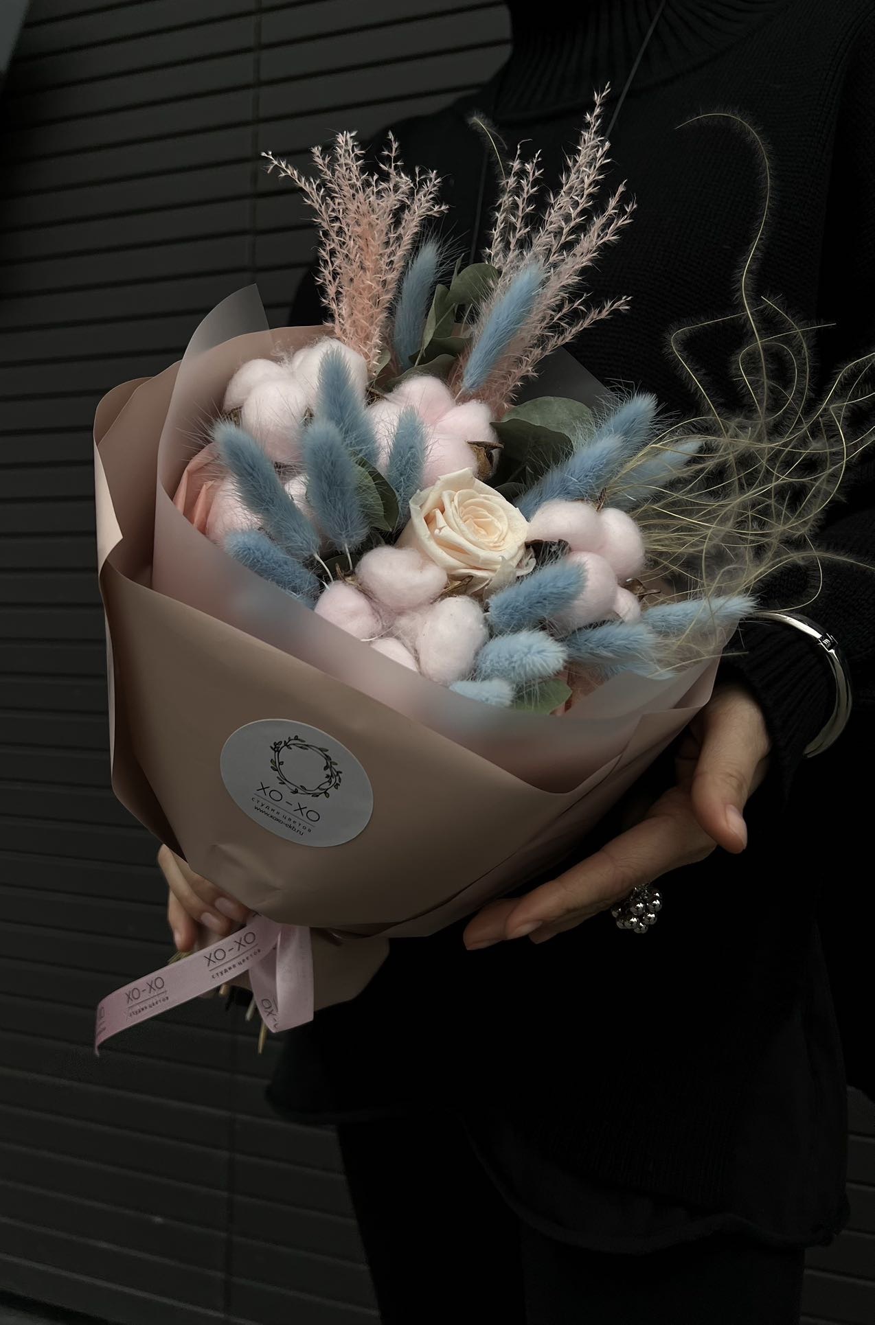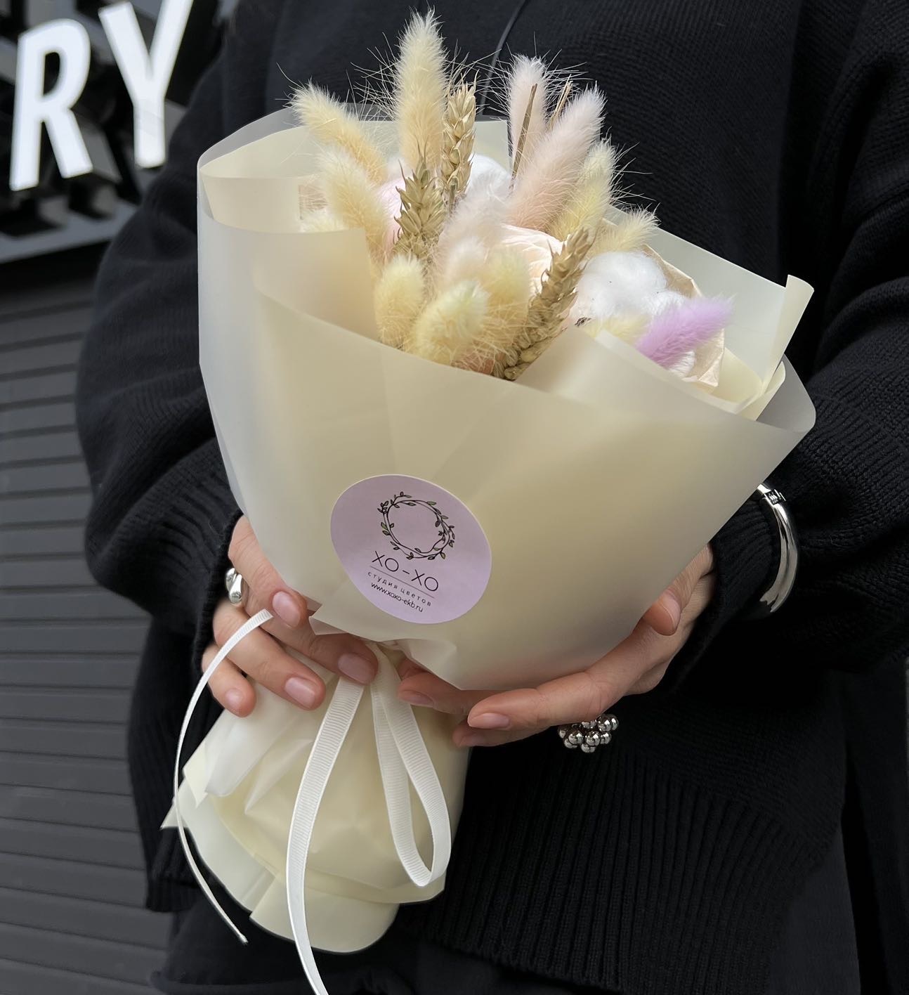 Оригинальный вариант букета из сухоцветов. В составе стабилизированные розы, которые будут радовать вас 2-4 года. Цвет роз можно выбрать любой по предзаказу за 10-14 дней.