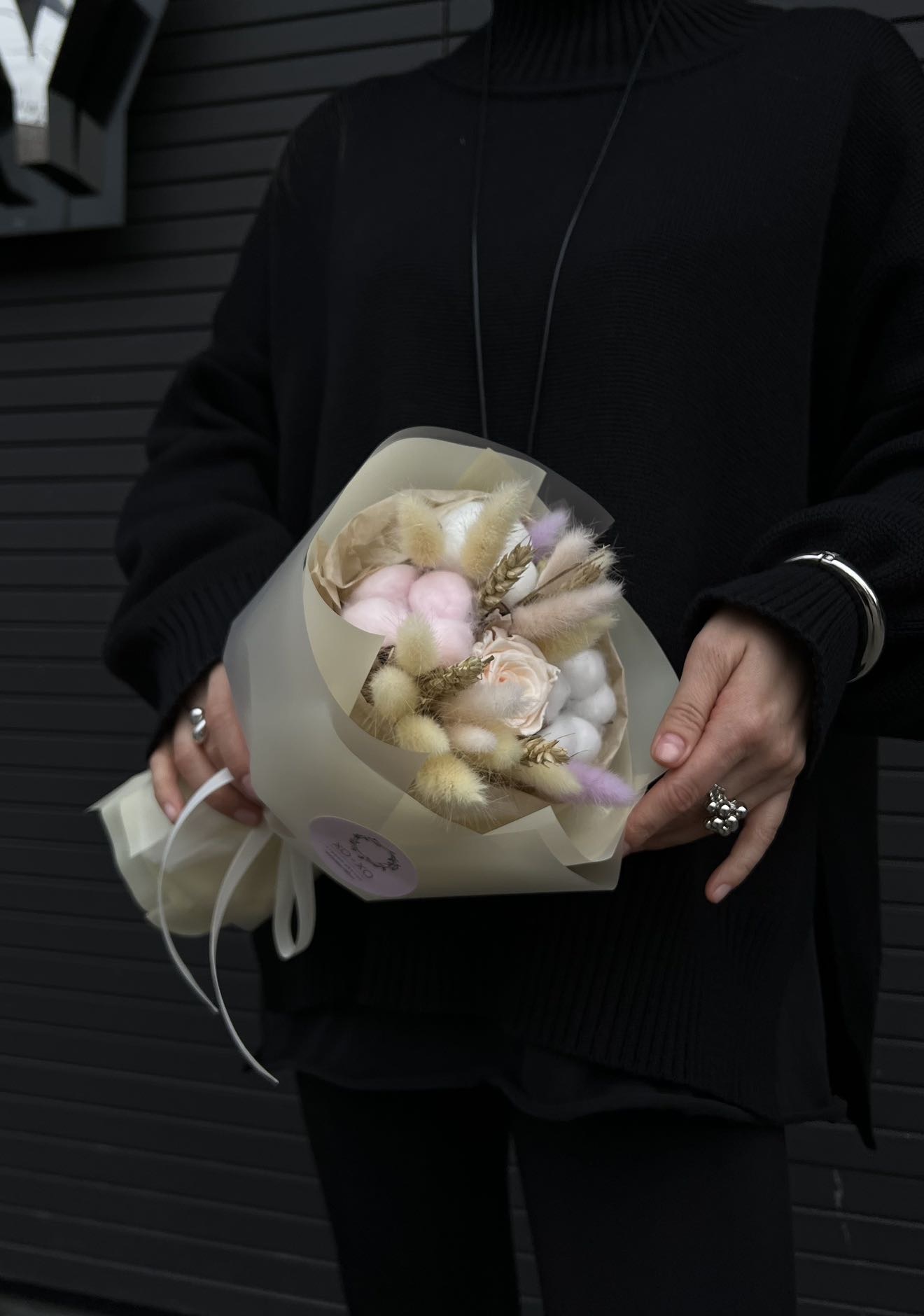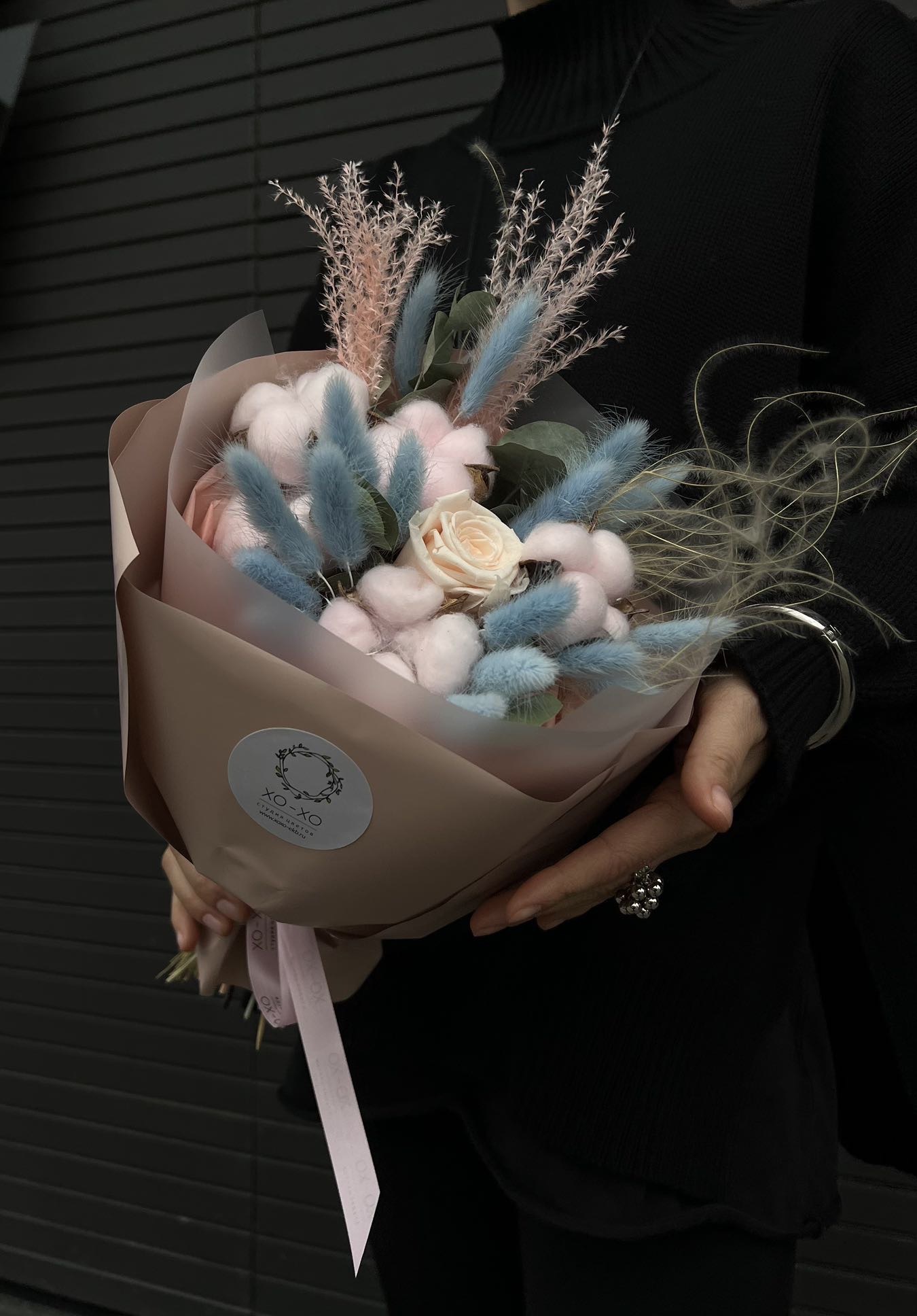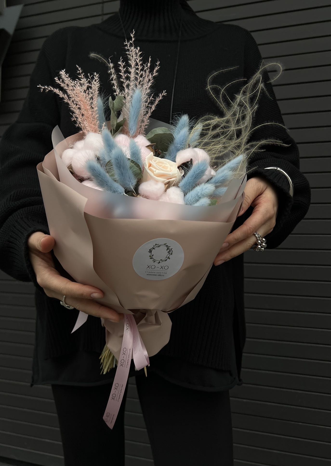 Оригинальный вариант букета из сухоцветов. В составе лаванда, хлопок, лагурус розовый, лимониум, стабилизированная роза. Срок годности сухоцветов от 2х- до 5 лет.