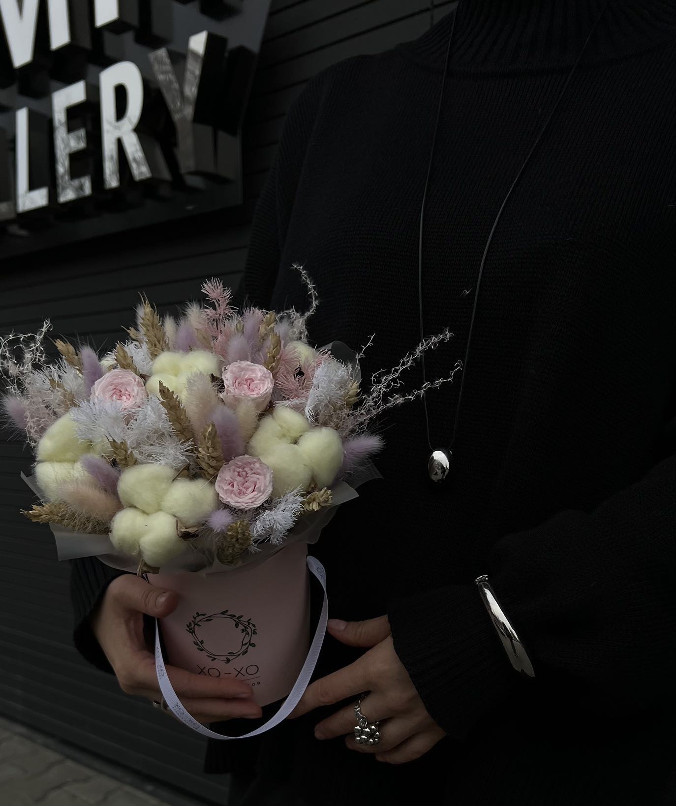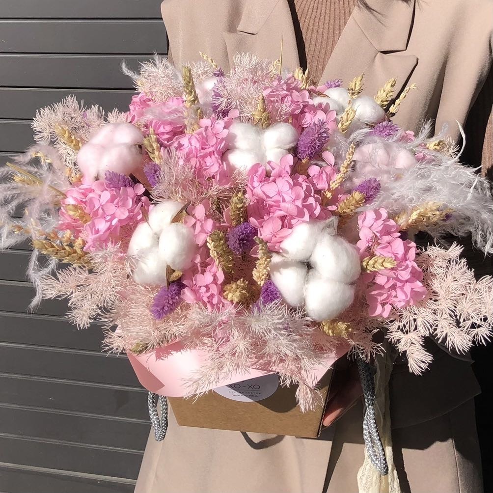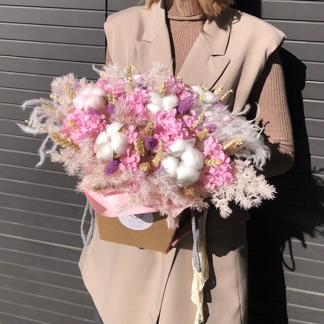 Оригинальный вариант букета из сухоцветов. В составе лаванда, хлопок, лагурус розовый, лимониум, стабилизированная роза. Срок годности сухоцветов от 2х- до 5 лет.
