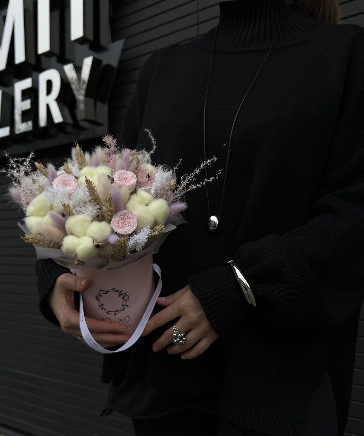 Оригинальный вариант композиции из сухоцветов. Шляпная коробочка диаметром 10 см, композиция около 25 см. Во главе композиции стабилизированные розы. Заказы на подобные композиции с пожеланиями сделать в определенной гамме, принимаем за 7-14 дней. По наличию можно уточнить у флористов.