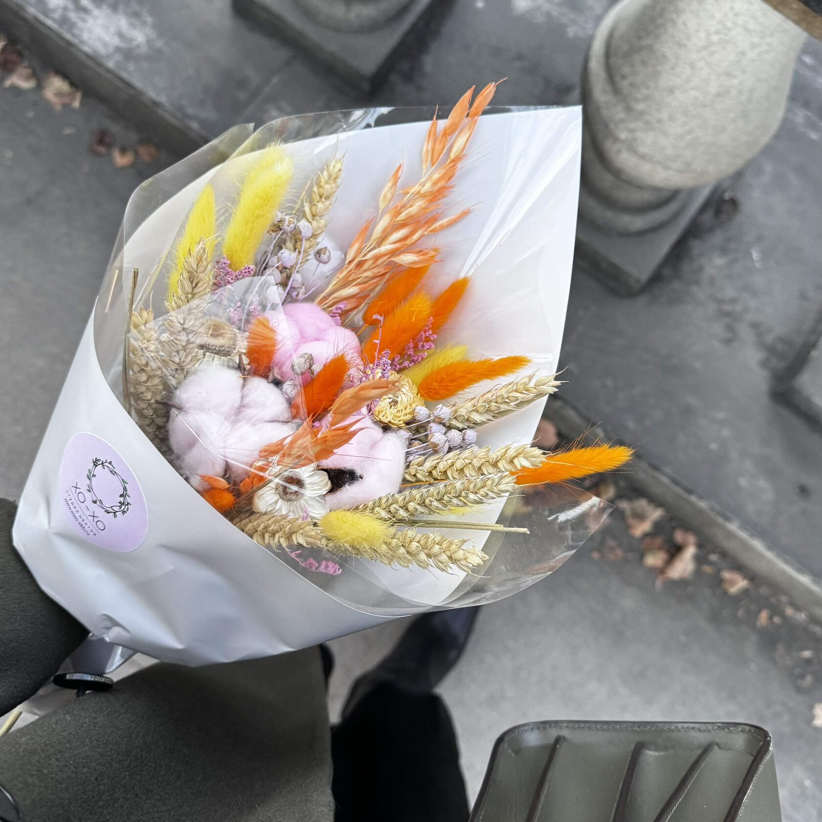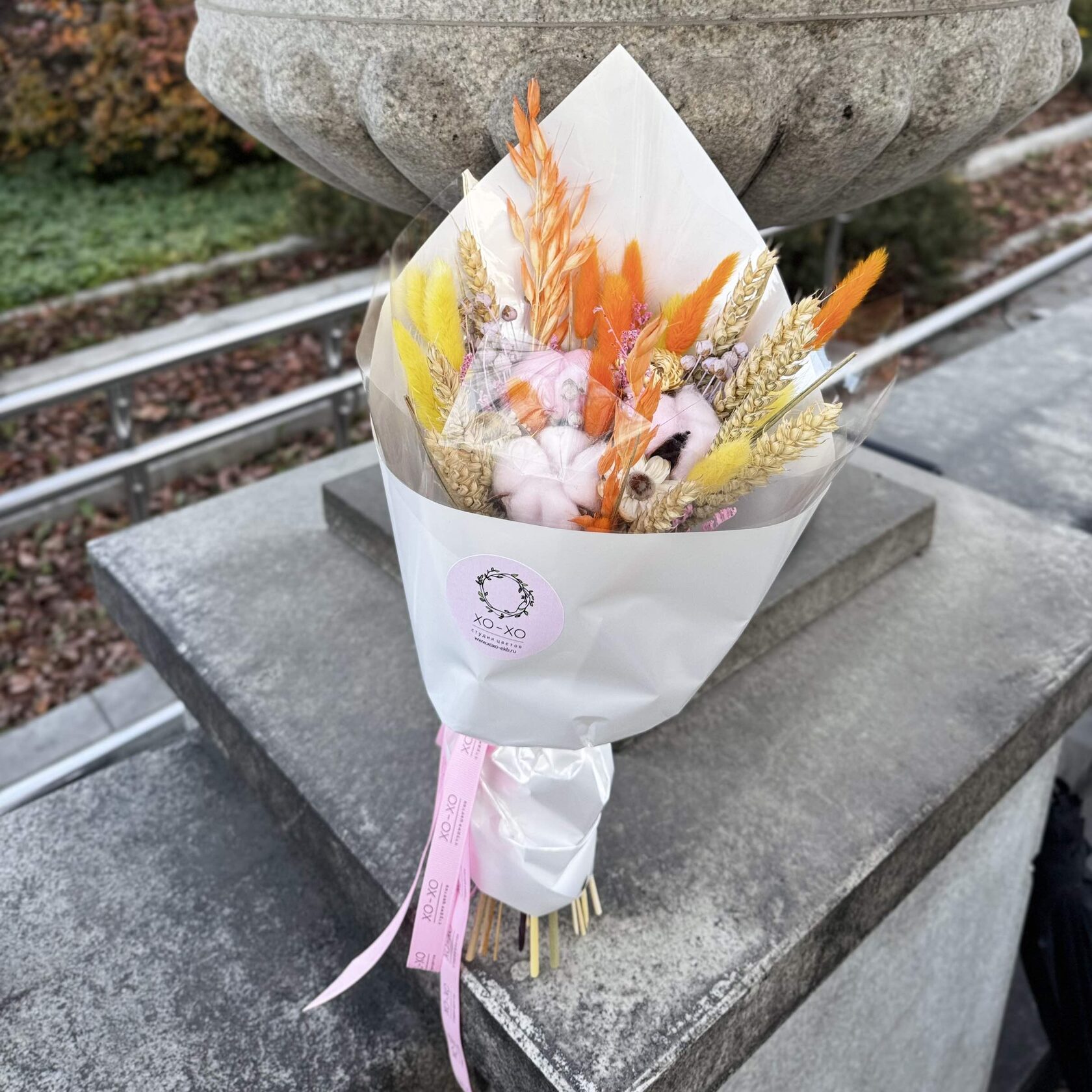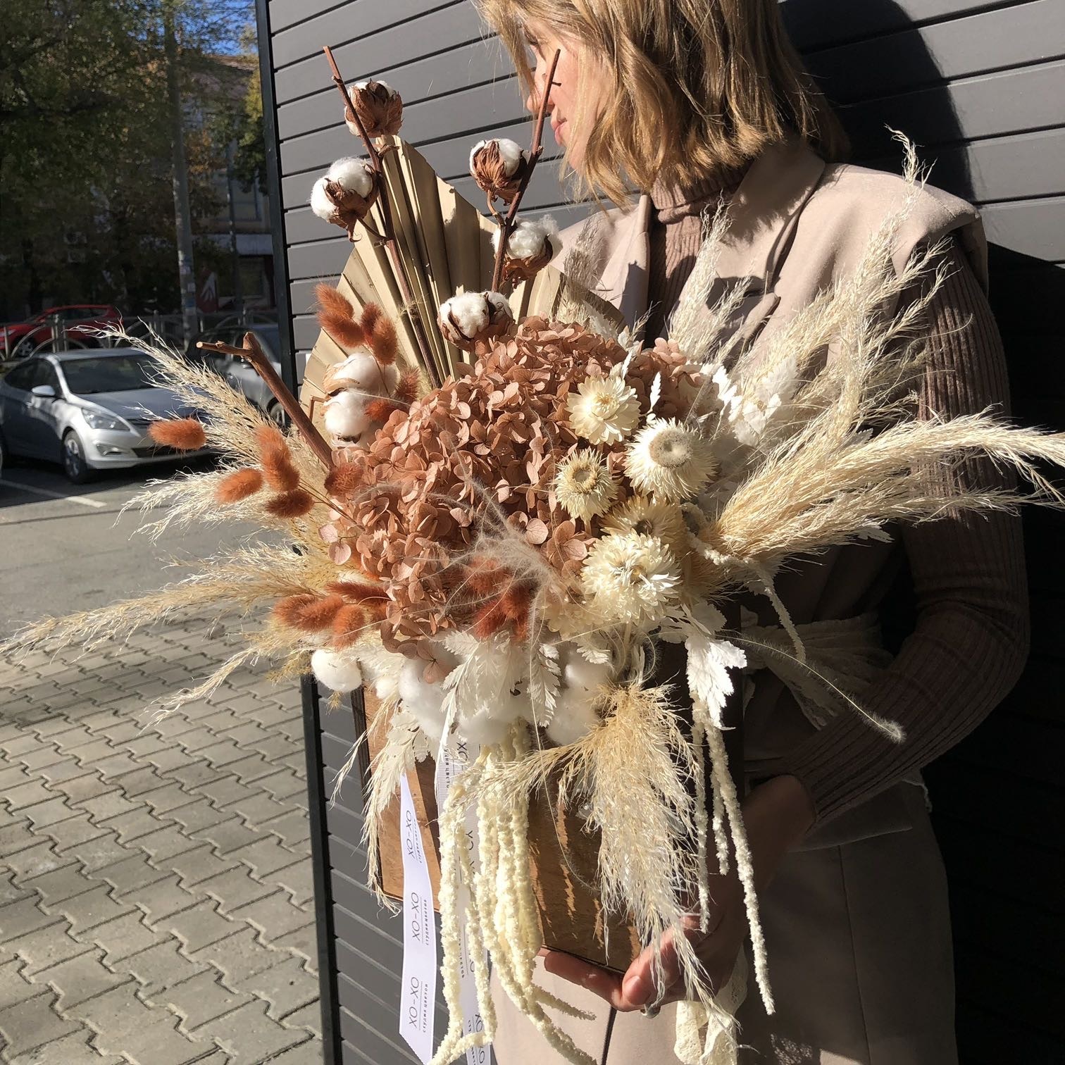Оригинальный вариант букета из сухоцветов. Состав может быть разнообразным. В упаковке или без. Цена за шт без упаковки 1750, в упаковке от 2000.