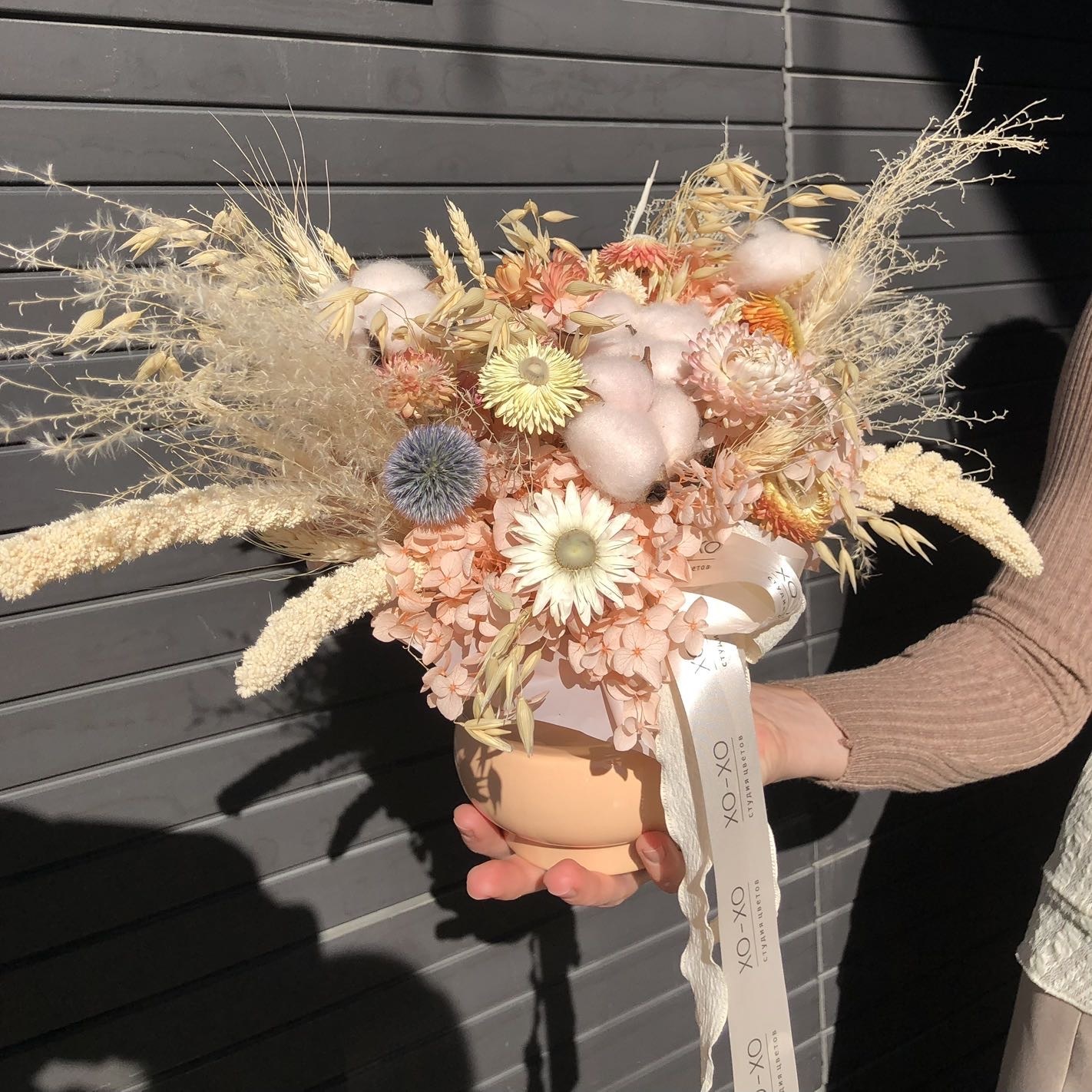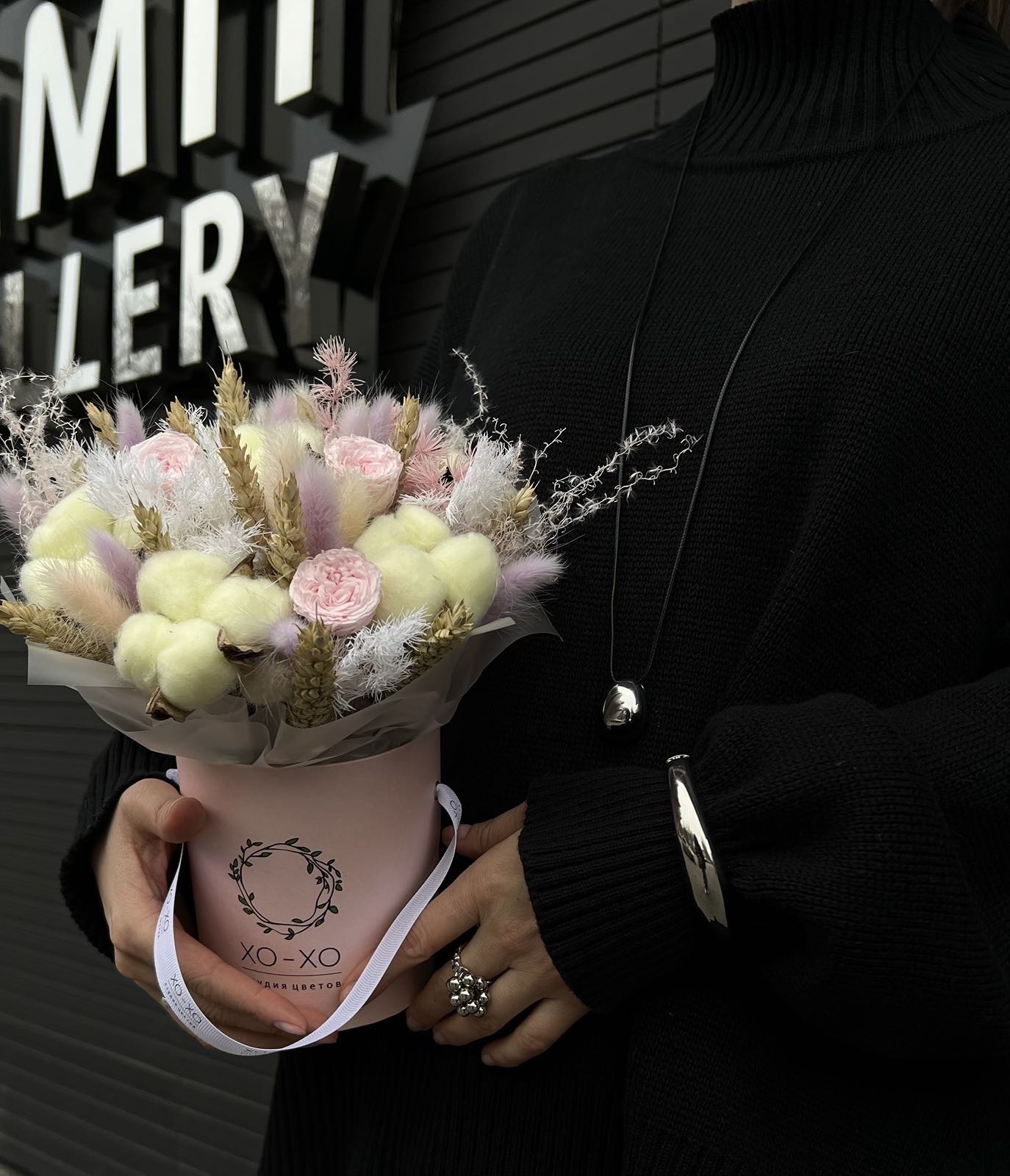 Оригинальный вариант букета из сухоцветов в шляпной коробке диаметра 10 см, с цветочной шапкой 25-28 см.